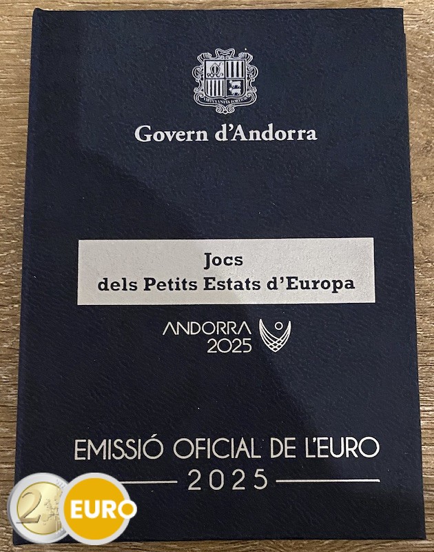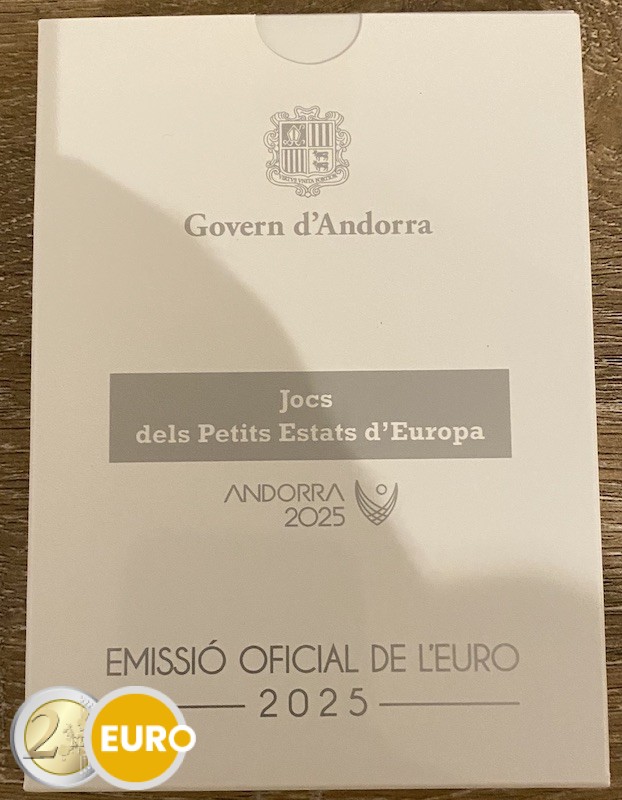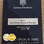 The core of the coin shows various sporting elements, including balls from different sports, with stylised nets as a background. They all have a dynamic style that exudes movement and energy. At the top is the inscription “Jocs dels Petits Estats d’Europa” and at the bottom is “ANDORRA 2025”.