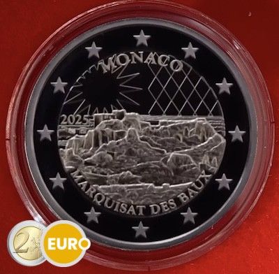 On the obverse is depicted in the center the famous rock of Les Baux-de-Provence (Bouches-du-Rhône) in its present state, together with the surroundings of the village of Les Baux-de-Provence. At the top of the coin appears the issuing country “MONACO”, accompanied on the right by a checkered shield and on the left by the star symbolizing Les Baux. At the bottom are the inscription “MARQUISAT DES BAUX”, the year of issue “2025”, as well as the mintmarks of the Monnaie de Paris and the general engraver Joaquin Jimenez. On the outer ring of the coin are the twelve stars of the European flag.