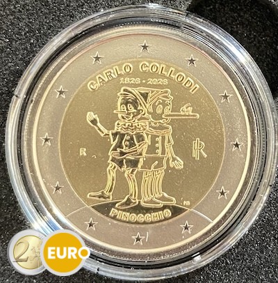 De 2 euro herdenkingsmunt van Italië uit 2026 viert de 200e verjaardag van de geboorte van Carlo Collodi, de Italiaanse schrijver die wereldwijd beroemd werd met het verhaal van Pinocchio. De nationale zijde toont een levendige voorstelling van Pinocchio met zijn karakteristieke lange neus en zijn schaduw die naar de pratende krekel kijkt, een scène die de verbeelding en moraal van het meesterwerk symboliseert. Bovenaan staat “CARLO COLLODI” met de jaartallen “1826 – 2026”, en onderaan verschijnt het woord “PINOCCHIO”. Deze munt brengt hulde aan een van de bekendste figuren uit de kinderliteratuur en aan het literaire erfgoed van Italië.