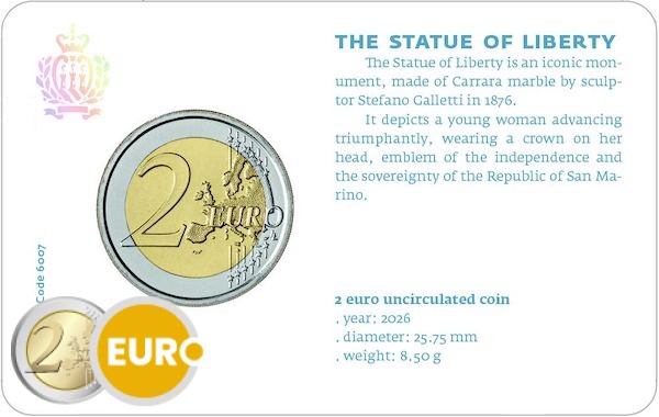 San Marino brengt in 2026 zijn reguliere 2 euro munt uit in een aantrekkelijke coincard. De coincard is voorzien van een prachtige afbeelding van het Vrijheidsbeeld, een wereldwijd symbool van vrijheid en onafhankelijkheid.