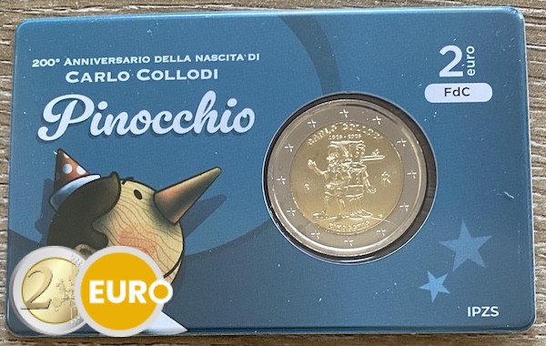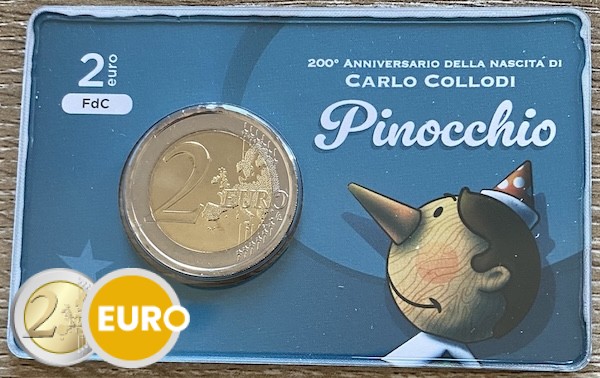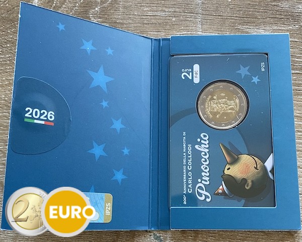 Diese 2 Euro Gedenkmünze Italiens 2026 würdigt den 200. Geburtstag von Carlo Collodi, dem italienischen Autor, der mit der Geschichte von Pinocchio weltbekannt wurde. Die nationale Seite zeigt eine lebhafte Darstellung von Pinocchio mit seiner markanten langen Nase, dessen Schatten zum sprechenden Grille blickt – ein Symbol für die Fantasie und die moralischen Lehren des Klassikers. Oben steht „CARLO COLLODI 1826 – 2026“, unten „PINOCCHIO“. Diese Münze ehrt eine der bekanntesten Figuren der Literatur und das kulturelle Erbe Italiens.