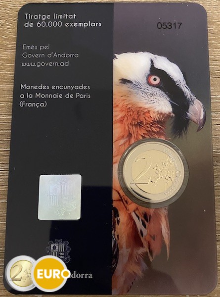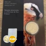 Esta moneda está dedicada al quebrantahuesos (Gypaetus barbatus), una de las aves más emblemáticas del Pirineo andorrano. Esta especie de buitre, reconocible por su denso plumaje y su pico ganchudo, se encuentra actualmente en la lista de especies en peligro de extinción. Con esta emisión, Andorra quiere destacar la importancia de proteger y preservar sus especies.