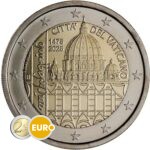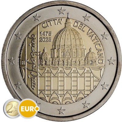 Cúpula de la basílica de San Pedro, diseñada por Miguel Ángel, en la que trabajó hasta su muerte en 1564. Debajo se muestra un detalle de la bóveda de la Capilla Sixtina, dividida en secciones por Miguel Ángel y decorada con frescos de su autoría. A la izquierda figuran la ocasión de emisión «michelagniolo», la marca de ceca «R» de la Casa de la Moneda de Roma y el nombre de la diseñadora «D. LONGO». El Estado emisor «CITTÀ DEL VATICANO» se sitúa en el borde superior derecho. Debajo aparecen el año de nacimiento de Miguel Ángel «1475» y el año de emisión «2025».