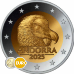 Op de munt is een gedetailleerd portret van de kop van de lammergier te zien, naar rechts kijkend. De effen achtergrond benadrukt de imposante uitdrukking. Onder de afbeelding staan de naam van het land, “ANDORRA”, en het jaartal “2025”, allemaal omlijst door de zilveren ring met de twaalf sterren van de Europese Unie.
