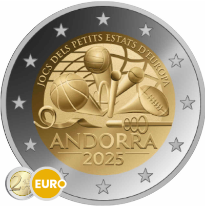 De kern van de munt toont verschillende sportelementen, waaronder ballen van verschillende sporten, met gestileerde netten als achtergrond. Ze hebben allemaal een dynamische stijl die beweging en energie uitstraalt. Bovenaan staat het opschrift “Jocs dels Petits Estats d’Europa” en onderaan staat “ANDORRA 2025”.