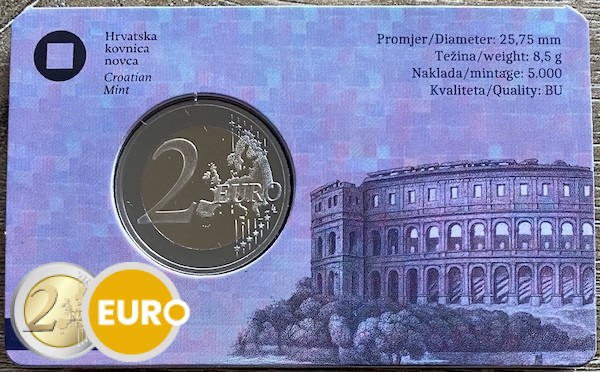 Deze 2 euro herdenkingsmunt eert het Amfitheater van Pula, een van de best bewaarde Romeinse arena’s ter wereld. Dit indrukwekkende bouwwerk uit de 1e eeuw is een symbool van Kroatië’s rijke erfgoed en geschiedenis.