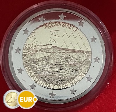 Op de voorzijde staat centraal de beroemde rots van Les Baux-de-Provence (Bouches-du-Rhône) in zijn huidige staat, samen met de omgeving van het dorp Les Baux-de-Provence. Aan de bovenzijde van de munt is de uitgevende staat „MONACO” te zien, rechts vergezeld van een geruit schild en links van de ster die Les Baux symboliseert. Aan de onderzijde zijn de uitgifteaanleiding „MARQUISAT DES BAUX”, het uitgiftejaar „2025” en de munttekens van de Monnaie de Paris en van de algemeen graveur Joaquin Jimenez afgebeeld. Op de buitenste muntring staan de twaalf sterren van de Europese vlag.